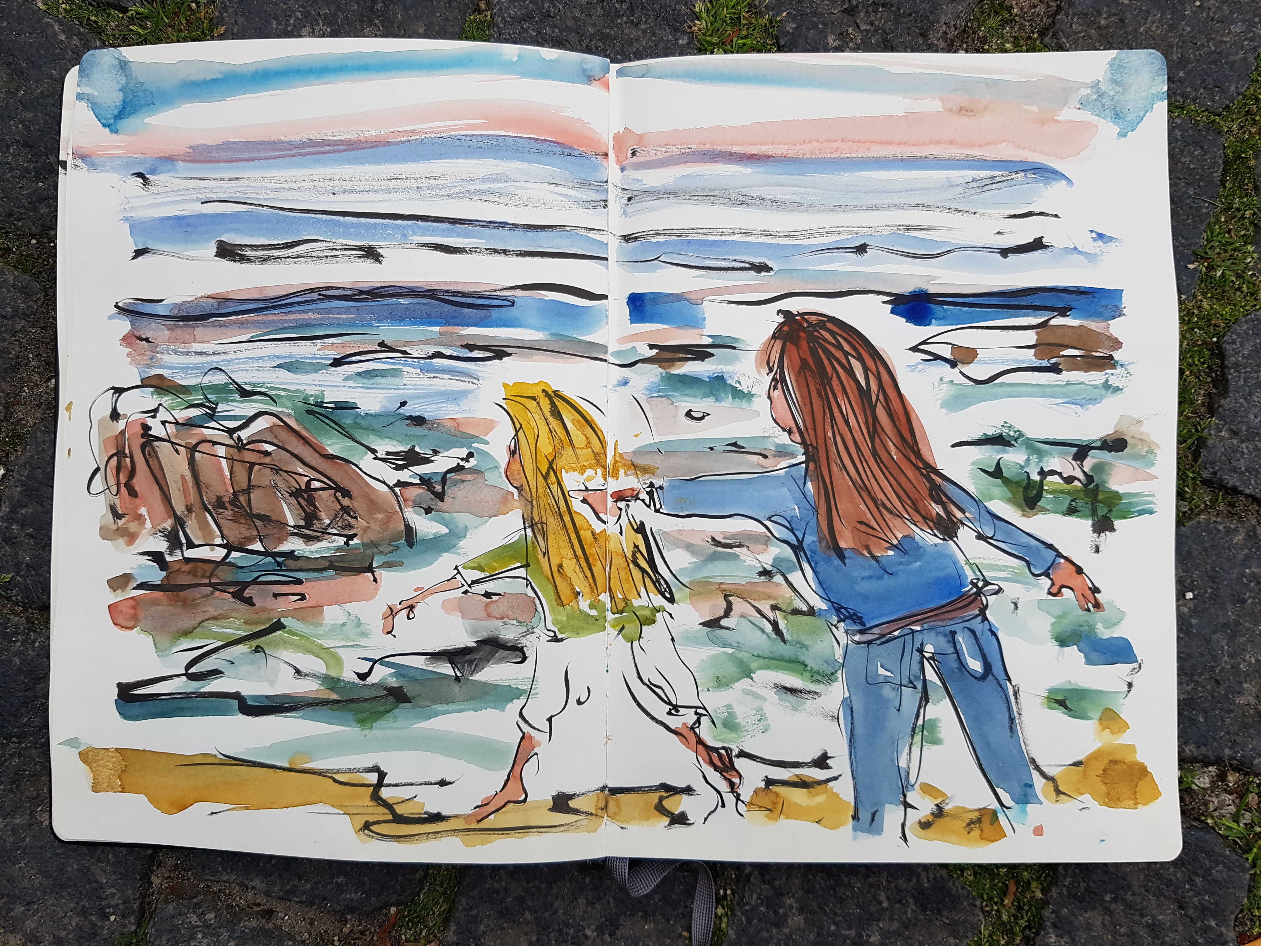 Bornholm-moleskine-sketch-two-girls-at-beach-drawing-by-frits-ahlefeldt