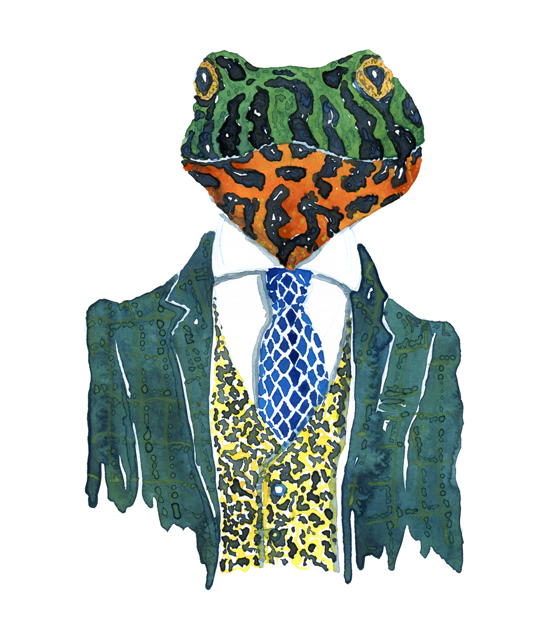 watercolor-animal-portrait-firebellied-frog-amphibian-in-suit-artwork-by-frits-ahlefeldt