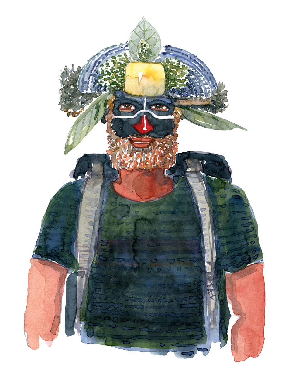 watercolor-nature-hiker-white-stripe-face-aboriginal-man-backpacker-by-Frits-ahlefeldt