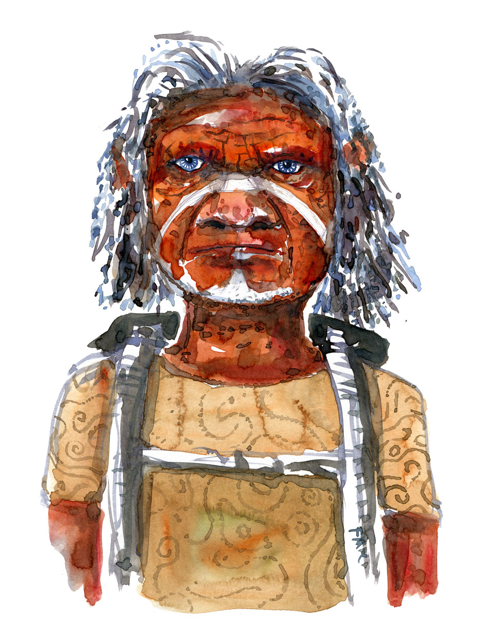 watercolor-nature-hiker-white-stripe-face-aboriginal-man-backpacker-by-Frits-ahlefeldt